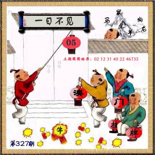 327期挂牌《一日不见》 解释:一天不见,就好象过了三年。形容思念的心情非常迫切。 解料:一日不见,01兔鼠,日解日肖兔龙蛇马羊猴,前两天开的鸡蛇。 七肖:兔鼠龙蛇马羊鸡 五肖:兔鼠龙蛇马 四肖:兔鼠龙蛇 三肖:兔鼠龙 二肖:兔鼠 一肖:兔 |